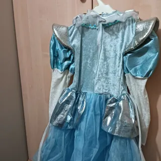 Bellissimo vestito da principessa azzurro, perfetto per feste o recite. - Tessuto lucido e leggero. - Dettagli in pizzo bianco. - Maniche a sbuffo con balze. - Cintura in vita con fiocco.