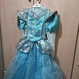 Bellissimo vestito da Cenerentola per bambina, taglia 5 anni. Perfetto per feste a tema o recite. - Tessuto principale azzurro in velluto. - Maniche a sbuffo con dettagli argentati. - Gonna a più strati con tulle scintillante. - Collo arricciato con paillettes azzurre.