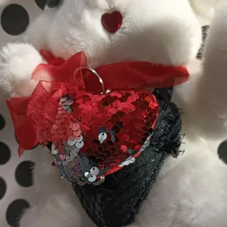 Peluche a tema San Valentino, un tenero coniglietto bianco. - Dettaglio a forma di cuore rosso con paillettes. - Fiocco rosso decorativo. - Piccolo cuore rosso applicato sul muso.