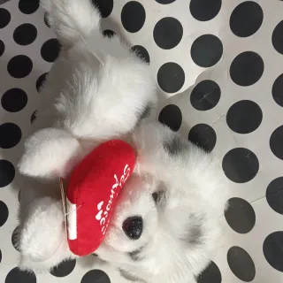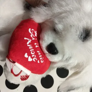 Simpatico peluche a forma di cane bianco, tiene tra le zampe un morbido cuore rosso. - Morbido al tatto. - Dettagli ricamati sul cuore.
