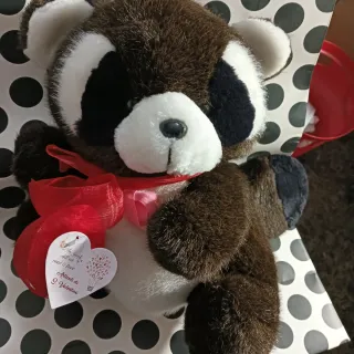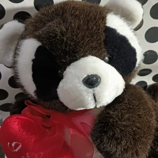 Morbido peluche a forma di procione, perfetto per un regalo speciale. Tiene tra le zampe un cuore rosso. - Dettagli in bianco e nero sul muso. - Fiocco rosa sul cuore.