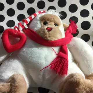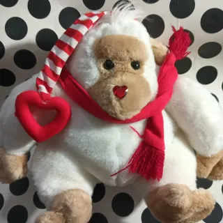 Morbido peluche a forma di scimmia bianca, perfetto per un regalo. - Cappello a righe rosse e bianche. - Sciarpa rossa con frange. - Dettaglio a forma di cuore rosso sul muso.