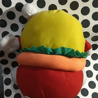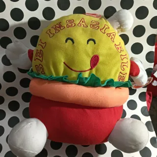 Simpatico peluche a forma di hamburger, perfetto per i più piccoli. - Morbido tessuto giallo per il pane superiore con ricamo SEI INSIAZIABILE. - Faccia sorridente con lingua rossa. - Strati colorati che simulano gli ingredienti. - Braccia e gambe bianche.