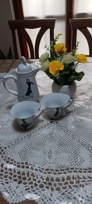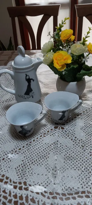 Elegante set vintage composto da caffettiera e due tazze, con un'originale decorazione. - Caffettiera con coperchio. - Due tazze con manico. - Decorazione con figura stilizzata. Flamenco Bischofsthal collection