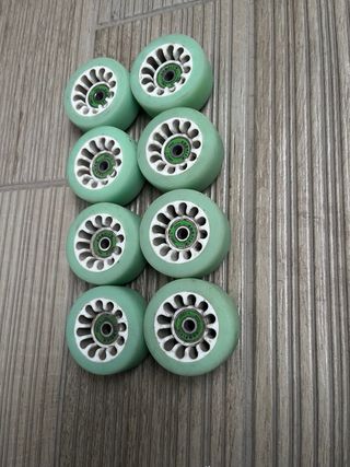 Set di 8 ruote per pattinaggio artistico, ideali per la disciplina Solo Dance. Le ruote sono di colore verde acqua e presentano un design con fori. - Marca: Komplex - Modello: Pro - Cuscinetti inclusi