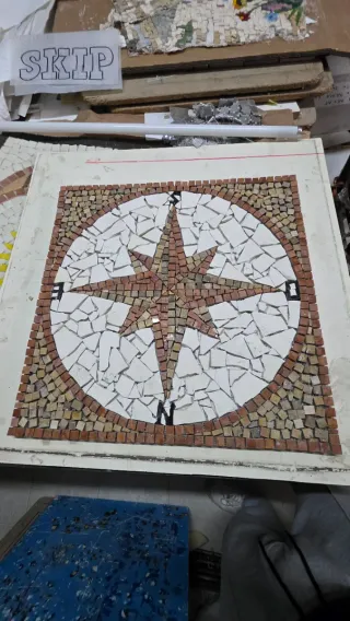 Bellissimo mosaico artigianale a forma di rosa dei venti, perfetto per decorare qualsiasi ambiente Misura 60x60 cm - Realizzato con tessere in ceramica e pietra. - Design unico con dettagli curati.