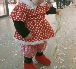 Bellissimo Vestito carnevale Minnie marca Pegasus taglia 18/24 mesi in raso stampato a pois con bordatura in merletto bianco e sottogonna in tulle! Frontino con fiocco abbinato Guanti in maglina, cintura, pantalone in tulle ricamato bianco foderato in raso rosso, con fondo in ciniglia nera Copriscarpe rosse in maglina accoppiata! Il vestito è dotato di chiusura a zip sul retro ed elastico in vita per una vestibilità comoda. Il look è completato da dettagli preziosi come fiocchi, pois, merletti che rendono il costume scenico e adorabile. Tessuti utilizzati: ciniglia, raso stampato, tulle, maglina, merletto e pizzo!