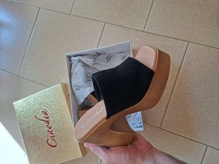 Sandali eleganti Ciaodea con tacco. - Tomaia in morbido camoscio nero. - Suola platform in ecopelle color cuoio. - Design moderno e confortevole.