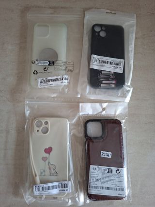 Set di 4 cover per iPhone 13/14. - Cover color crema con adesivo circolare. - Cover nera con stampa di libri. - Cover color crema con disegno di elefanti e palloncini. - Cover in similpelle marrone.