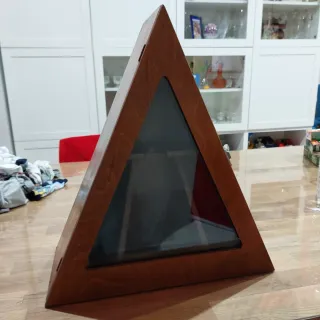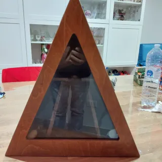 Bacheca in legno a forma piramidale, ideale per esporre una bottiglia. - Struttura in legno con finitura lucida. - Pannello frontale in vetro. - Design triangolare unico.