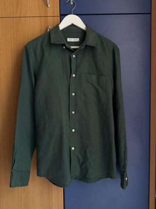 Camicia Zara taglia M, in buone condizioni generali. N.B Il collo presenta un leggero scolorimento, sia internamente che esternamente, dovuto al normale utilizzo. Difetto non troppo evidente, visibile solo da vicino. - Composizione: 50% cotone, 50% lino. - Colore: verde. - Taglia: M.