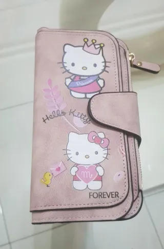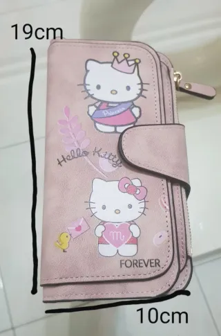 Portafoglio con stampa Hello Kitty, ideale per portare con sé tutto il necessario. - Dimensioni: 19x10cm - Design con due stampe di Hello Kitty - Chiusura con bottone a pressione e zip laterale