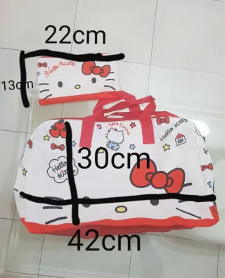 Set composto da una borsa e una pochette coordinata pieghevole ideale per palestra sport e viaggio impermeabile materiale resistente , entrambe con il tema Hello Kitty. - Borsa capiente con manici. - Pochette pratica per piccoli oggetti. - Design con stampe Hello Kitty e dettagli rossi.