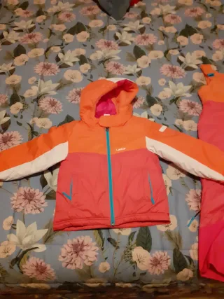 Tuta da sci per bambina, perfetta per le giornate sulla neve. Il design vivace la rende facilmente visibile. - Colore principale arancione con inserti rosa. - Cappuccio integrato. - Zip frontale. - Tasche laterali con bordino azzurro.