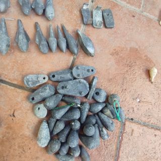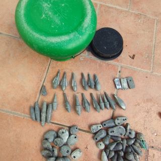 Circa 75 piombi di diverse misure /forme e peso compreso contenitore per esche