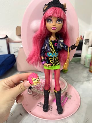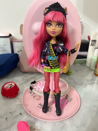 Bambola di Howleen Wolf della linea Monster High. La bambola ha lunghi capelli rosa e indossa un outfit colorato. - Include un accessorio a forma di riccio. - Cappello nero con orecchie da lupo. - Giacca viola lucida. - Collana con borchie. - Collant rosa. - Stivali neri alti.