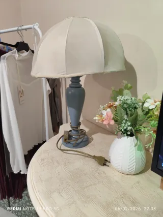Lampada da tavolo in stile shabby chic con base in legno azzurro pastello. - Paralume in tessuto color crema. - Dettagli decorativi in filo dorato. - Base in legno lavorato.