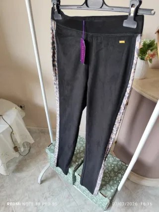 Pantaloni neri con un tocco di stile grazie alla banda laterale maculata. - taglia 42/44 - Banda laterale con fantasia animalier. - Vita elasticizzata per un maggiore comfort.
