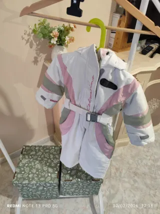 Tuta da neve Colmar per bambina, taglia 12 mesi. Colore bianco con dettagli rosa e verdi. - Cappuccio integrato. - Cintura in vita con fibbia. - Tasche frontali.