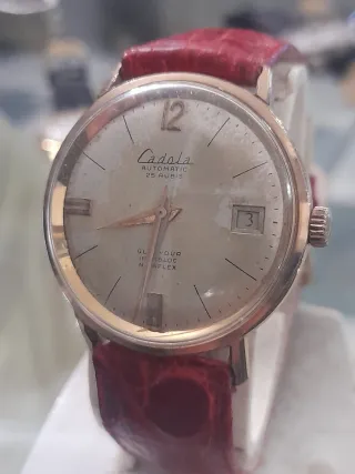Orologio da polso automatico Cadola, un pezzo unico degli anni '60. - Cassa color oro. - Cinturino in pelle rossa con finitura a squame. - Quadrante chiaro con indici e numeri romani. - Datario a ore 3. - Movimento automatico 25 rubis.
