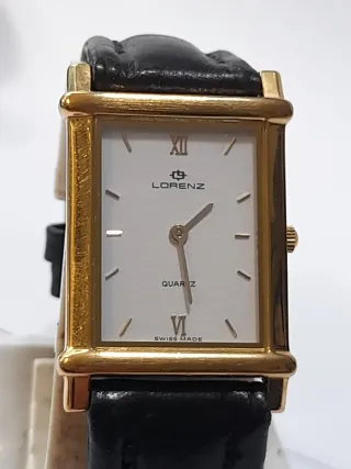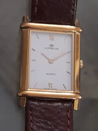 Elegante orologio da polso Lorenz con cassa dorata e cinturinomarrine nuovo - Quadrante bianco con indici. - Movimento al quarzo. - Swiss Made. Funzionate La sottile cassa misura 25mm x35