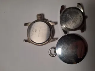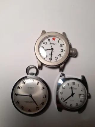 3 orologi da usare come ricambi o da riparare. Un tasca Con Cassa in acciaio Credo monoblocco, mortima Marciante ma non preciso 35 Condizzioni estetiche ottime Soviet con grande cassa in metallo da 45 mm compreso copri corona, Funzionava bene, poi se. Staccato il rubino del bilanciere e ha smesso di funzionare Venduti in blocco non faccio sconti. Astenersi soliti e inutili perditempo !!@