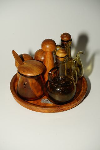 Set da cucina composto da bottiglie in vetro con tappo in legno, porta spezie con cucchiaino e base in legno. Design di riferimento natura/bosco, ideale per cucina, tavola o decorazione. Condizioni molto buone, nessuna rottura. - Realizzato in vetro trasparente e marrone. - Tappo in legno per una chiusura ermetica. - Manico pratico per una presa sicura. - Beccuccio sottile per un versamento controllato.