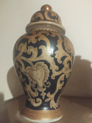 Elegante vaso decorativo con un design intricato. Possibilità di.avere tutto il set di 3 vasi per un totale di 100 euro - Finitura nero e oro. - Realizzati in ceramica porcellana - Coperchio con pomello decorativo.