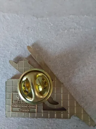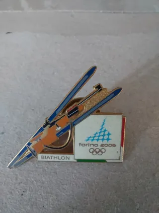 Spilla commemorativa delle Olimpiadi Invernali di Torino 2006, dedicata alla disciplina del Biathlon. - Design raffigurante sci e fucile. - Logo Torino 2006 con anelli olimpici.
