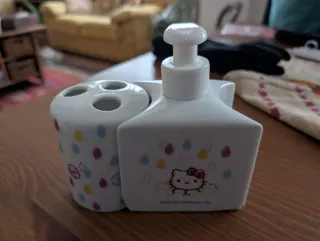 Grazioso set da bagno in ceramica a tema Hello Kitty. Perfetto per aggiungere un tocco di allegria al bagno. - Dispenser per sapone con pompa. - Portaspazzolini con tre alloggiamenti. - Decorazioni colorate a pois e con personaggio. Il portasapone è scheggiato sul retro visibile in foto ma non si nota Il porta spazzolini è perfetto