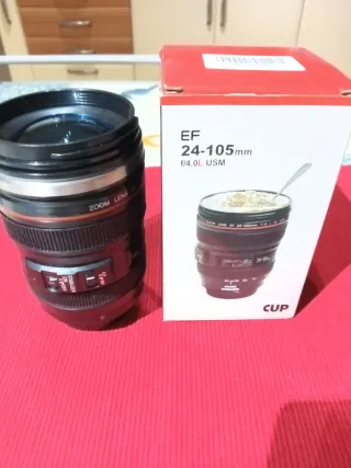Tazza termica dal design unico che ricorda un obiettivo fotografico📷.Capienza 250ml Comoda da viaggio,per caffè,tisane, cappuccino e bevande analcoliche. Nuova in scatola originale. Ottima per una Idea regalo 🎁 Con tappo trasparente,in acciaio inossidabile. N.B.Non porta il cucchiaino🥄 - Forma ispirata all'obiettivo Canon EF 24-105mm f/4.0L USM. - Ideale per gli appassionati di fotografia. Per info contattatemi