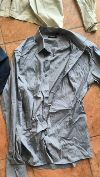 Set composto da una giacca e due camicie da uomo. Le camicie sono di due marche primo emporio XL blu e Antony Morato Taglia 50 grigia, ma sono state strette in vita, perciò le vendo a questo prezzo in set - Giacca color beige. - Camicia blu. - Camicia grigia.