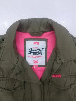Giacca in stile militare Superdry, taglia XS. Presenta una fodera interna color fucsia vivace. - Design con tasche frontali. - Dettagli con bottoni e zip. - Patch con bandiera Union Jack sulla manica.