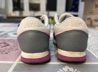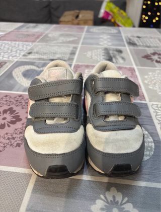 Scarpe Nike per bambina, taglia 26. Le scarpe sono da smacchiare nella parte chiara. Non presentano segni di usura o altro. Sono solo da lavare meglio. - Chiusura a strappo. - Design grigio e bianco con dettagli rosa.