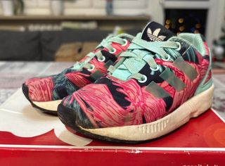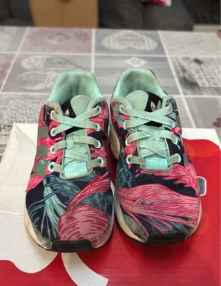 Scarpe Adidas ZX Flux per bambina, taglia 25. Presentano una vivace fantasia floreale con tonalità rosa, blu e verdi acqua, con le iconiche tre strisce Adidas in argento. Con segni di usura. Vedi foto. - Fantasia floreale colorata. - Dettagli a tre strisce Adidas. - Chiusura con lacci.