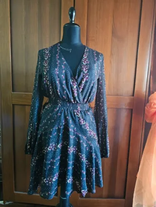 Elegante vestito Guess con una stampa floreale su sfondo nero. - Scollo a V. - Maniche lunghe. - Elastico in vita. - Gonna svasata.