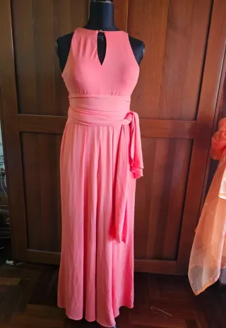 Elegante tuta lunga color corallo, perfetta per occasioni speciali. - Scollo a V con dettaglio cut-out. - Cintura in vita con drappeggio. - Tessuto fluido e leggero.