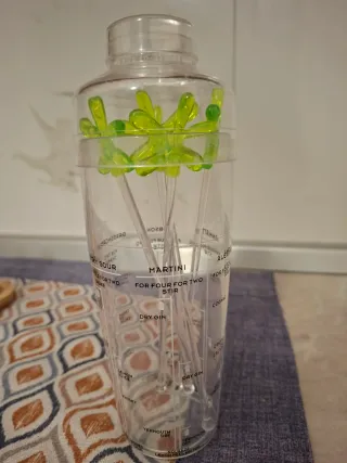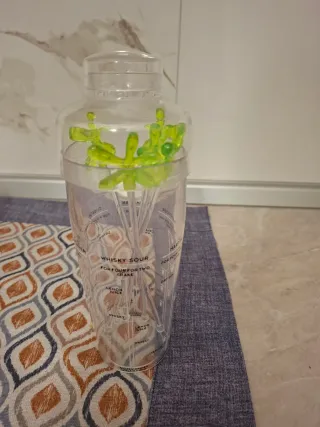Shaker per cocktail trasparente con simpatiche decorazioni verdi all'interno. Utile per preparare le tue bevande preferite. - Misure per cocktail stampate sul corpo dello shaker.