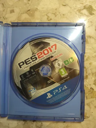 Disco di gioco per PlayStation 4, Pro Evolution Soccer 2017. - Copertina con i giocatori Neymar Jr., Messi, Suárez e altri. - Logo UEFA Champions League presente. - Classificazione PEGI 3.