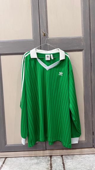 Maglia a maniche lunghe Adidas Originals in stile retro. - Colore verde con righe verticali nere. - Colletto bianco a V. - Iconiche tre strisce bianche sulle maniche. - Logo Adidas ricamato sul petto.