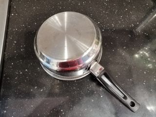 Pentolino in acciaio inossidabile con manico in plastica nera. - Diametro: 15 cm - Materiale: Acciaio inossidabile e plastica
