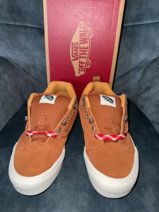 Scarpe Vans Knu Skool in taglia 37. - Tomaia in tessuto scamosciato marrone. - Dettagli rossi sui lacci. - Suola bianca in gomma. PROD-275 HOL