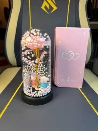 Lampada decorativa a batteria con una rosa dorata e due orsetti. - Rosa con petali rosa e dorati. - Base nera. - Cupola in vetro. - Decorazioni a forma di palline colorate. PROD-214 B1