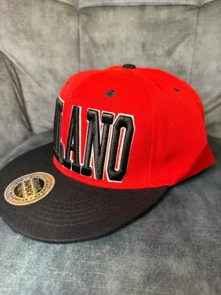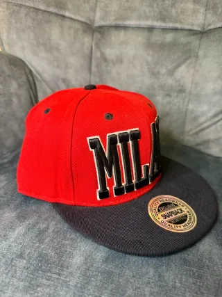 Cappello da baseball con visiera piatta, modello Milano. - Design bicolore con corona rossa e visiera nera. - Scritta MILANO ricamata sul davanti. - Etichetta Snapback Quality Headwear sul lato. PROD-261 Box