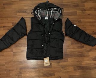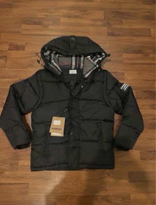 Elegante giubbotto Burberry di colore nero. - Cappuccio foderato con motivo a quadri. - Chiusura frontale con zip e bottoni. - Tasche laterali con zip. - Logo Burberry sul braccio sinistro.