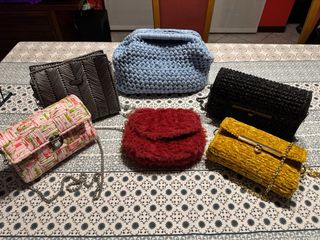 Set di borse artigianali, perfette per aggiungere un tocco unico al tuo stile. - Una borsa in morbido tessuto rosso con manici in legno. - Una pochette viola con chiusura a scatto e catenella. - Una borsa grigia in tessuto peloso con manici in pelle. - Una borsa color crema in corda con manici in legno. - Una borsa a tracolla verde e gialla. - Una pochette blu in maglia.