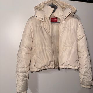 piumino corto (modello crop) firmato Guess Los Angeles, color panna/crema satinato. Un capo moderno, caldo e ricco di dettagli iconici, perfetto per l'inverno. Caratteristiche principali: • Marca: Guess • Taglia: S (IT 40 / EU S) • Colore: Panna con finitura leggermente lucida • Design: * Logo Guess ripetuto tono su tono lungo le maniche e sulla fascia posteriore • Cappuccio ampio e imbottito • Chiusura frontale con zip e bottoni automatici sul collo • Coulisse regolabile sul fondo per stringere la vita • Tasche laterali con cerniera Stato dell’articolo: Il piumino è in buone condizioni generali, l'imbottitura è ancora ben gonfia e