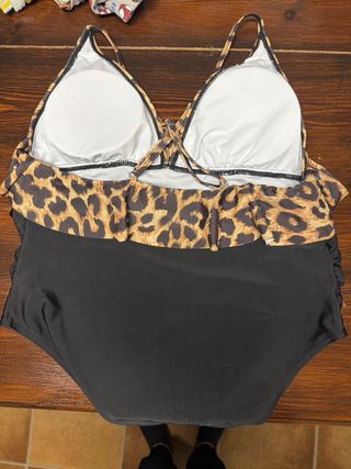 Costume da bagno intero con fantasia leopardata e parte inferiore nera. Ideale per la maternità. - Top con volant e stampa animalier. - Spalline sottili incrociate. - Parte inferiore a tinta unita.
