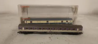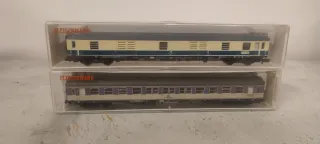 Due carrozze ferroviarie Fleischmann in scala N. - Carrozza bagagliaio 8190 senza illuminazione - Carrozza passeggeri 8117 senza illuminazione Usate, in ottime condizioni, non presentano segni di usura. Con scatola originale