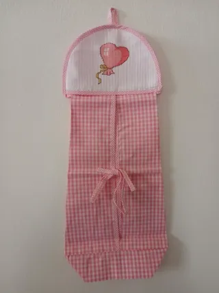 Portapannolini da appendere, facile, pratico e comodo con laccio frontale. Bubabù Made in Italy 100% cotone italiano con stampa a quadretti vichy, parte superiore in etamine ricamata con un cuore. Apertura con laccio sul davanti per l'inserimento dei pannolini. Quadretti bianchi e rosa. Qualità made in Italy Misure: 26x13x63 cm